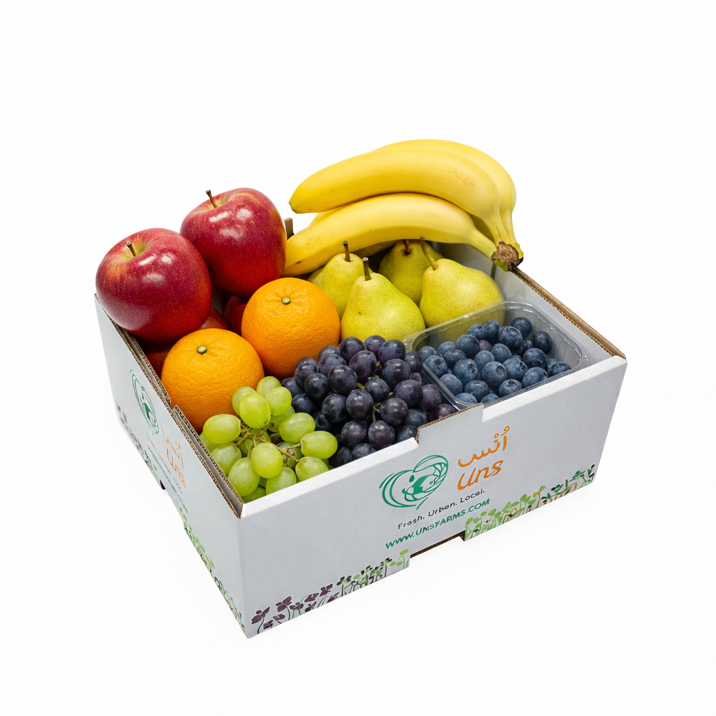 A deluxe assortment of fresh, hand-picked fruits including apples, bananas, pears, oranges, grapes, and berries. Ideal for snacking, smoothies, lunch boxes, and healthy family eating. Packed carefully for freshness and delivered clean across the UAE.